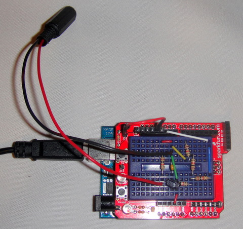 The Arduino is an amazingly flexible platform that is gaining some traction in the area of sound. This is a work in progress, but the Arduino pictured here has breadboarded on the prototype shield a filter and voltage divider to get the output to line level. How is it programmed to make sound? Well, this is the part that is in progress, but I am working on using direct digital synthesis (DDS) to construct sounds. I have programmed into it various wavetables such as square wave, sine, noise and sawtooth. The reproduction of the waveforms at different frequencies is certainly impressive given the hardware being used. The design will use potentiometers or other analog sensors to change frequency and other modulating parameters.