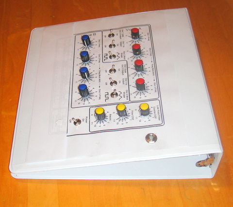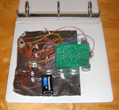 On the inside of the binder I used a sheet of aluminum foil to provide proper grounding to all of the pots and switches. The binder has a 1/4" mono jack to allow connection to an amplifier with a standard cable.