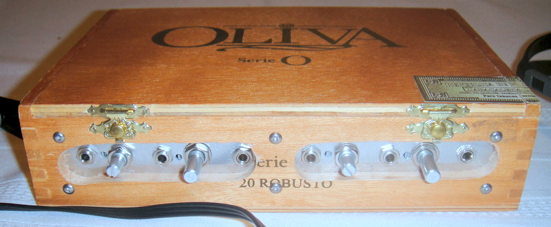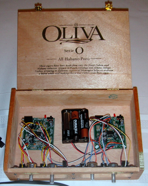 The cigar box has two mic kits so I can connect 4 mics to the unit. The sidewall of the cigar box was a little thick for the potentiometers and jacks, so I milled some large access slots and drilled out an aluminum plate to mount the controls. The power of both units are tied together so it only needs 3 AA batteries to run both units.