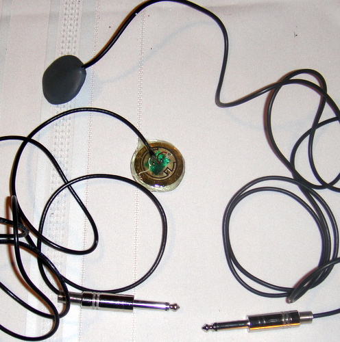 Parts: I used a piezo-electric buzzer, shielded coaxial cable, epoxy, poster putty, and a ¼" mono audio plug. I soldered two of the three wires coming from the piezo disk to the cable and then fully coated it with epoxy to protect the disk and the cable.